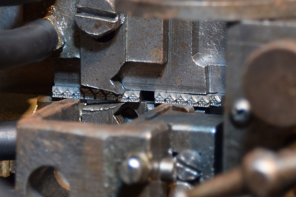 地金を電熱やガスの熱によって300度以上の高温で溶解し、ノズルから噴射して母型を接触させた鋳型に充填します。鋳型部分は活字のボディとなり、母型部分が文字の形になります。